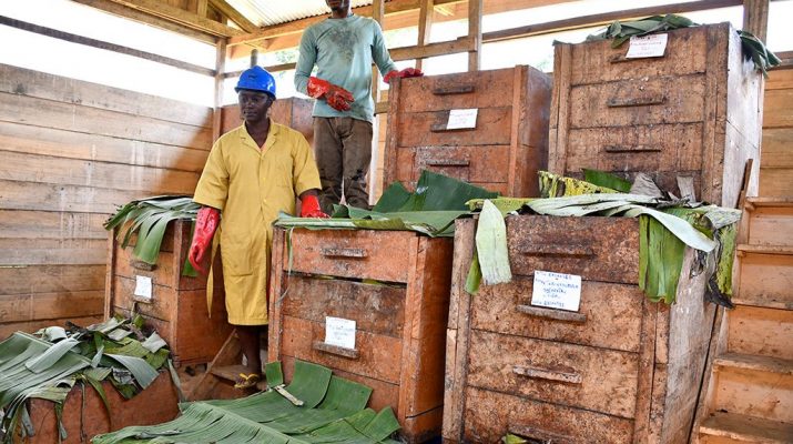 Pour les Ets Cacao-Cam, la fermentation est l’une des pratiques les plus importantes post-récolte. Elle est faite pendant 06 jours et ne doit en aucun cas être excédée de peur de perdre la qualité du goût des fèves. Cette fermentation se fait directement après écabossage. Nos fermentations se font dans des caisses à fonds perforés. Ces caisses à fonds perforés sont disposées sur un support en escalier par rangées de 03, dont la première est remplie avec les fèves, puis est couverte avec les feuilles de bananier ou des sacs de jutes. Au second jour de la fermentation, nous ouvrons la caisse et la vidons sur la deuxième rangée en dessous. Nous répétons la même opération deux jours après pour la troisième rangée, en s’assurant que la pièce où se trouve les fèves est à 50° à partir du deuxième jour jusqu’à la fin du procédé. Certes fastidieux, cette opération contribue cependant à l’obtention des fèves bio de bonne qualité et de bonne couleur, dont la pureté du goût n’est pas entamée.