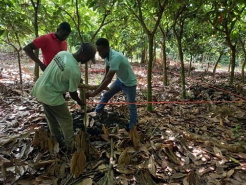 La bonne croissance de nos cacaoyers ainsi que celle des fèves est influencée par la formation de nos cacaoculteurs à la tenue des bonnes pratiques pendant la période de développement des cabosses. Conscients de la grande concurrence qui entoure ce marché, la valeur et la qualité de notre cacao bio produit doivent être des atouts essentiels pour un meilleur écoulement sur le marché international. Dès lors, la préparation du terrain pour nos futures plantations nécessite le défrichage, le nettoyage des sous-bois, et le piquetage dans le respect des écartements choisis. Nous effectuons des piquetages avec des bambous solides d’environ 1,5m de hauteur afin de déterminer où planter. La distance entre les lignes des plants de cacaoyer est de 3m et entre les cacaoyers est de 3m également. Les plants sont semés exclusivement durant la période du mois d’aout en octobre pour s’assurer d’un bon arrosage naturel pendant la saison des pluies.