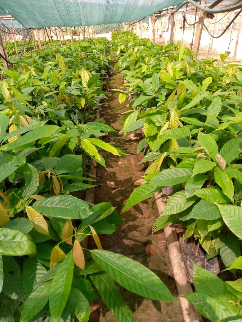 La production de notre cacao bio commence par la création des pépinières sui sont l’opération qui consiste à élever les jeunes plants de cacaoyers sous ombrière durant 6 à 8 mois avant leur transplantation. Cette opération permet de réduire la mortalité des jeunes plants. Pour cela, nous utilisons les cabosses issues des champs semenciers agréés. Cette opération respecte par ailleurs notre cycle saisonnier c’est-à-dire la mise en place de nos pépinières au mois de septembre jusqu’au mois de mars-avril, période à laquelle les plants sont robustes.